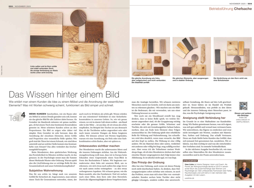 Moodmirror ist das erste systemische Werkzeug der Wohnpsychologie, das unbewusste Bedürfnisse, Motive und Prioritäten sichtbar macht – über Bild, Farbe, Material und Anordnung.